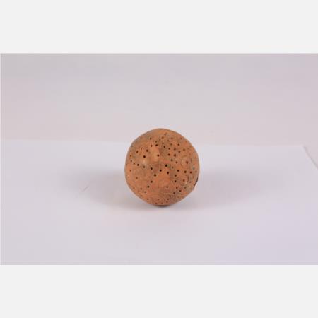 马家窑文化马厂类型素面球形摇响器,大高:5.5cm,小高:4cm,马厂类型是因为最早发现于青海民和县马厂塬而得名,在距今4350年至4050年之间。从考古发掘来看,其分布范围与半山类型大致相同,只是发展到了河西走廊的西端玉门一带,主要在甘肃和青海两省境内。半山类型结束后,马家窑文化进入马厂类型,分两支继续发展:一支以青海乐都县柳湾为代表,主要分布于兰州以西及青海地区,此支后发展为齐家文化;另一支沿河西走廊向西北发展,以甘肃省永昌县鸳鸯池遗存为代表,逐渐演变为四坝文化,向西进入新疆中部,最后在新疆绝迹。