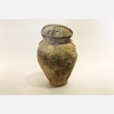 齐家文化鸮面,高:24.8cm,腹围:53.38cm,齐家文化,是以甘肃为中心的新石器时代晚期文化,并且已经进入铜石并用阶段,名称来自其主要遗址甘肃广河县齐家坪遗址。是分布在河西走廊地区的一支重要的早期青铜时代的考古学文化。
