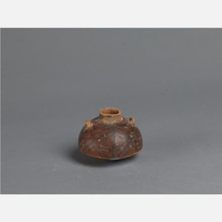马家窑文化马厂类型微型双横耳小口彩陶壶,高:6.2cm,直径:2.5cm,马厂类型是因为最早发现于青海民和县马厂塬而得名,在距今4350年至4050年之间。从考古发掘来看,其分布范围与半山类型大致相同,只是发展到了河西走廊的西端玉门一带,主要在甘肃和青海两省境内。半山类型结束后,马家窑文化进入马厂类型,分两支继续发展:一支以青海乐都县柳湾为代表,主要分布于兰州以西及青海地区,此支后发展为齐家文化;另一支沿河西走廊向西北发展,以甘肃省永昌县鸳鸯池遗存为代表,逐渐演变为四坝文化,向西进入新疆中部,最后在新疆绝迹。