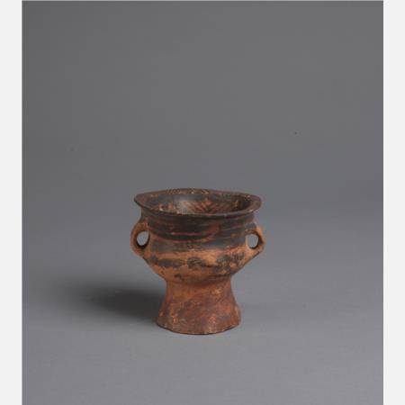 马家窑文化马厂类型晚期高圈足双耳彩陶罐,高:10cm,直径:9.5cm,马厂类型是因为最早发现于青海民和县马厂塬而得名,在距今4350年至4050年之间。从考古发掘来看,其分布范围与半山类型大致相同,只是发展到了河西走廊的西端玉门一带,主要在甘肃和青海两省境内。半山类型结束后,马家窑文化进入马厂类型,分两支继续发展:一支以青海乐都县柳湾为代表,主要分布于兰州以西及青海地区,此支后发展为齐家文化;另一支沿河西走廊向西北发展,以甘肃省永昌县鸳鸯池遗存为代表,逐渐演变为四坝文化,向西进入新疆中部,最后在新疆绝迹。