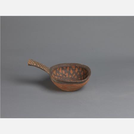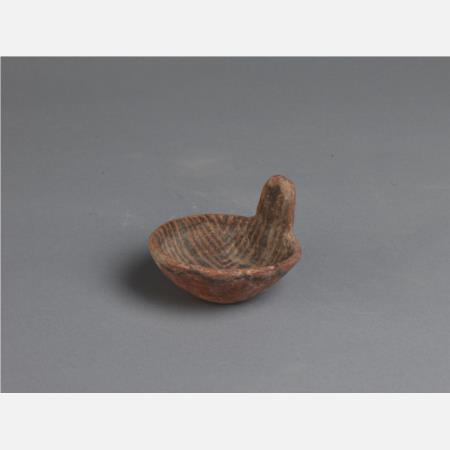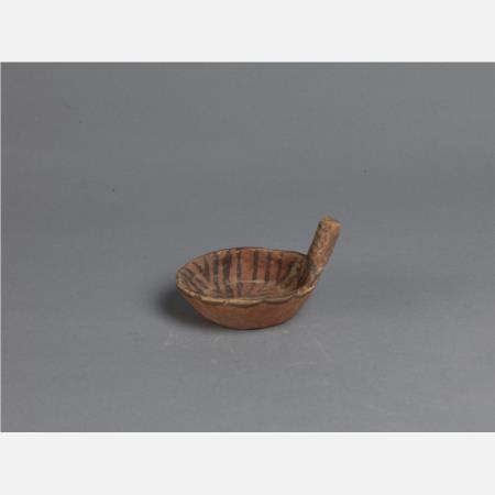 马家窑文化马厂类型短柄彩陶勺,高:6cm,直径:8.5cm,马厂类型是因为最早发现于青海民和县马厂塬而得名,在距今4350年至4050年之间。从考古发掘来看,其分布范围与半山类型大致相同,只是发展到了河西走廊的西端玉门一带,主要在甘肃和青海两省境内。半山类型结束后,马家窑文化进入马厂类型,分两支继续发展:一支以青海乐都县柳湾为代表,主要分布于兰州以西及青海地区,此支后发展为齐家文化;另一支沿河西走廊向西北发展,以甘肃省永昌县鸳鸯池遗存为代表,逐渐演变为四坝文化,向西进入新疆中部,最后在新疆绝迹。