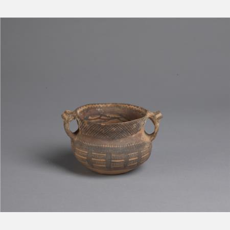 齐家文化船形陶壶,高:15.8cm,齐家文化,是以甘肃为中心的新石器时代晚期文化,并且已经进入铜石并用阶段,名称来自其主要遗址甘肃广河县齐家坪遗址。是分布在河西走廊地区的一支重要的早期青铜时代的考古学文化。