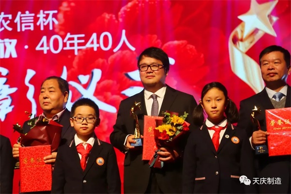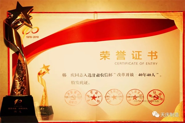 2018年12月29日,由省委宣传部指导,省总工会、省工信厅、省工商联、甘肃日报社联合主办的甘肃农信杯“改革开放·40年40人”表彰大会隆重举行,天庆集团韩庆董事长入选“改革开放·40年40人”。