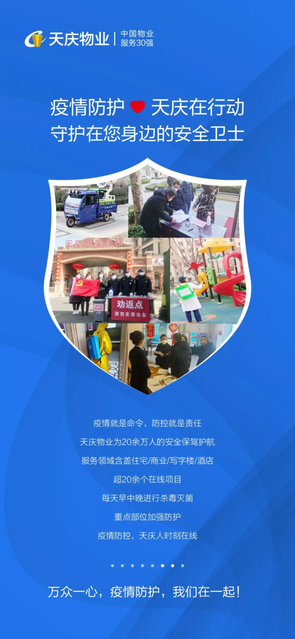 相信在政府的疫情防治工作规范指导下,在集团公司的领导下,在全体天庆物业人的坚守下,我们一定能与祖国一起严守严防,战胜新型冠状病毒,迎来春暖花开。