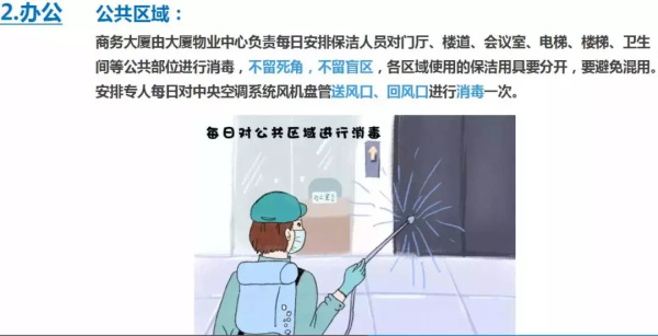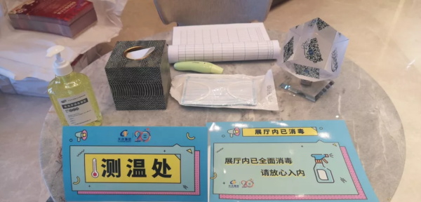 电梯内部随时补充纸巾,进行间接按电梯,每天下班前消毒清理医用垃圾桶的废弃口罩;放置有关疫情的防控知识展架,对各销售部展开全方位的严格防护;对沙盘、桌椅、门窗、卫生间等公共区域进行无死角消杀,杜绝病毒存在。