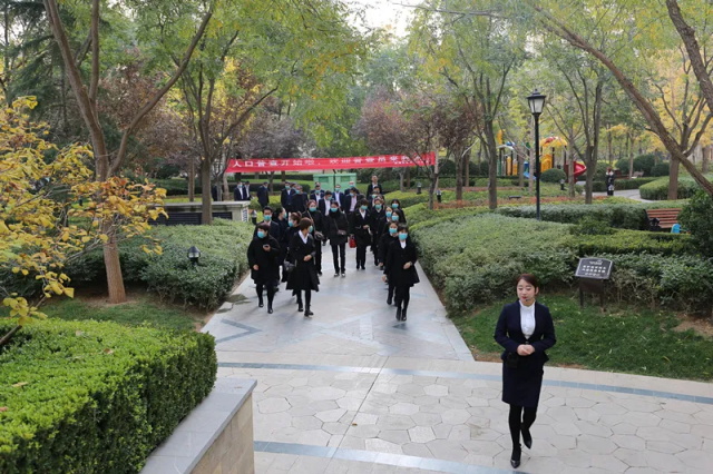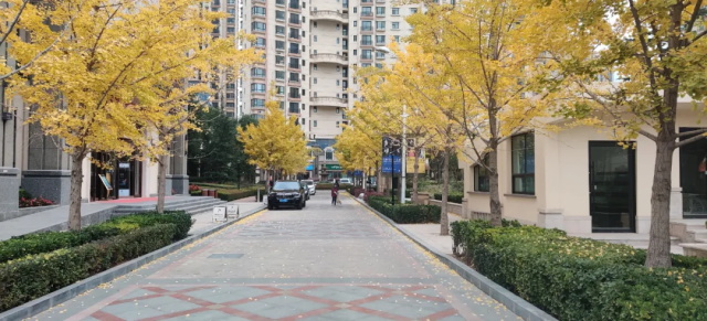上午9时,在天庆物业讲解员的带领下走进天庆格林小镇,深秋的天庆格林小镇,花园式的小区绿意不减,四季花卉与设计理念先进的楼体相映成辉,人行道两旁金黄的银杏树与来来往往的业主构成一幅欣欣向荣的美丽画卷,观摩团一行被格林小镇是秋却如春的园林景观深深吸引。