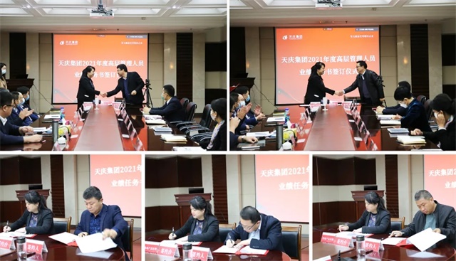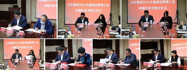 4月10日上午,天庆集团2021年度高层管理人员业绩任务书签订仪式在天庆国际商务大厦四楼会议室举行。天庆集团全体高层管理人员及在兰中层管理人员60余人参加了仪式。
