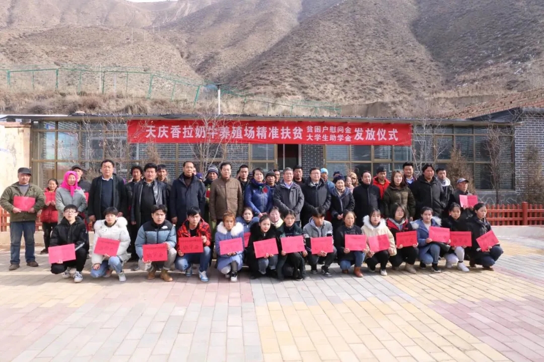 为助力“三区三州”全面打赢脱贫攻坚战,推动当地经济社会全面发展,天庆集团勇于创新,打破传统扶贫方式,出资150万元,向甘南合作市卡加曼乡香拉村捐建两所奶牛场,形成以养殖运营为依托,饲料种植、加工存储系统化管理,奶牛繁育及奶制品等衍生品销售有序经营的全产业链循环。设立了以养殖场为平台推行的“三变”改革及覆盖全村147户村民的“共济帮扶基金”,成为合作市农村“三变”改革示范点、脱贫攻坚巩固提升工程的代表,村民变股民,脱贫不返贫,现金分红,村民获得了在家门口的额外收益,造血式扶贫助推整村脱贫摘帽。先后荣获“合作市脱贫攻坚奉献奖”“合作市脱贫攻坚奋进奖”,开启了当地脱贫巩固的新模式,为乡村振兴贡献出了力量。