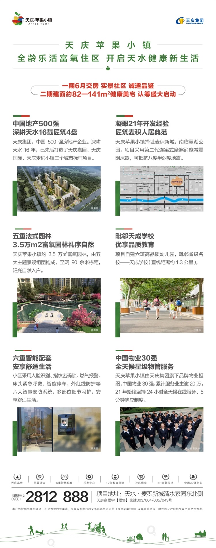 1、本广告仅作为天庆苹果小镇、天庆麦积小镇项目形象宣传使用,广告中所展示的户型结构、户型面积等内容后期可能存在一定变动,本公司可能会不定期对宣传材料进行修改,敬请留意最新宣传资料;