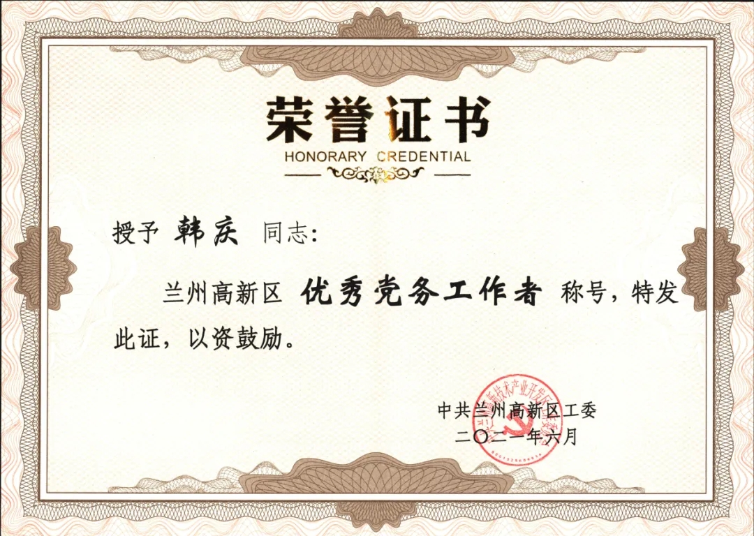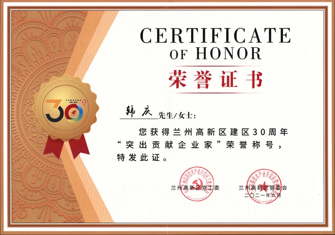 天庆集团党委书记、董事长韩庆怀揣赤子之心,将企业发展与社会责任紧密相连,以文化引领企业转型发展,支持社会公益,在城市建设、文博事业、教育事业等多领域持续发力,走出了一条多元、稳健的发展之路,实现城市生活的品位升级,人居环境的改善;精准扶贫、教育扶贫、文化公益、救灾赈灾用实际行动诠释一位企业家的社会责任和担当;旗下天庆实验中学和格林小镇幼儿园,走在了兰州市初中教育和学前教育的前列,成为兰州市城市文化教育名片、高品质知名民办教育品牌,为高新区乃至甘肃的社会经济全面发展注入了天庆力量。韩庆同志先后被授予全国“各民主党派无党派工商联人士为全面建设小康社会作贡献先进个人”“优秀中国特色社会主义建设者”“中华慈善突出贡献人物奖”“甘肃省劳动模范”“改革开放·40年40人”等多项荣誉,此次荣获“兰州高新区优秀党务工作者”、“兰州高新区建区30周年‘突出贡献企业家’荣誉称号”,是对其突出贡献的再一次肯定。