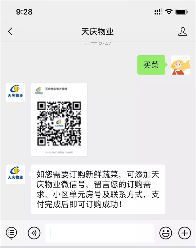 第一步,关注“天庆物业”微信公众号,后台发送“买菜”关键词