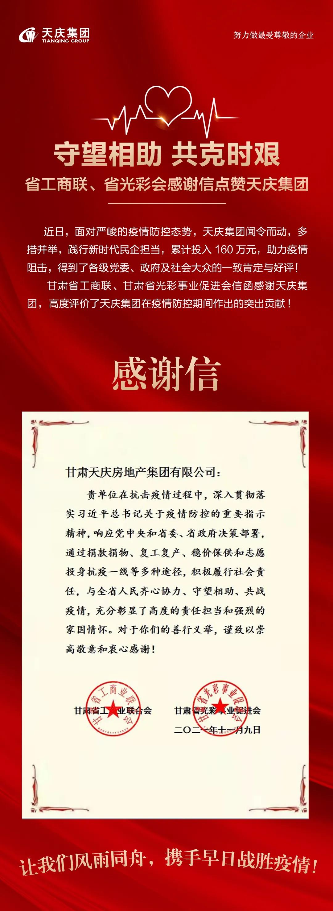 守望相助 共克时艰|省工商联、省光彩会感谢信点赞天庆集团