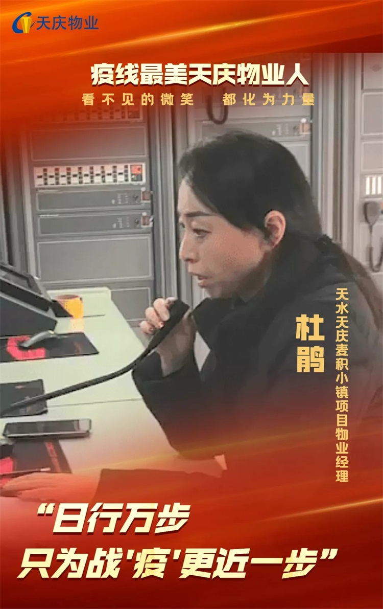 天水天庆麦积小镇物业项目经理杜娟,今年是她在天庆物业的第九个年头,从最初的一线员工到现在的项目负责人,“坚持”是她一路走来的初心和原则,也是她在疫情期间最常给员工加油打气的两个字。10月28日,天水天庆麦积小镇中午12点被紧急全面封控,随即3号、13号楼全面封闭。因为是休息时间,疫情导致部分员工返工受阻,她深知作为项目带头人,在疫情关键时刻,她要和小区里的员工站在一起,于是她义无反顾的申请加入,这么一进就是20天,整个小区加她最后只有仅仅11名物业工作人员,人手少任务重,却撑起了600户业主的希望。