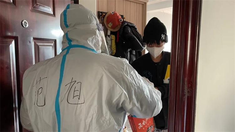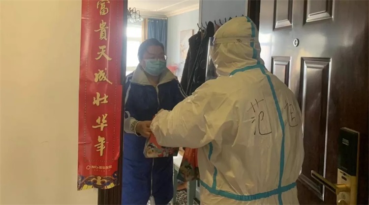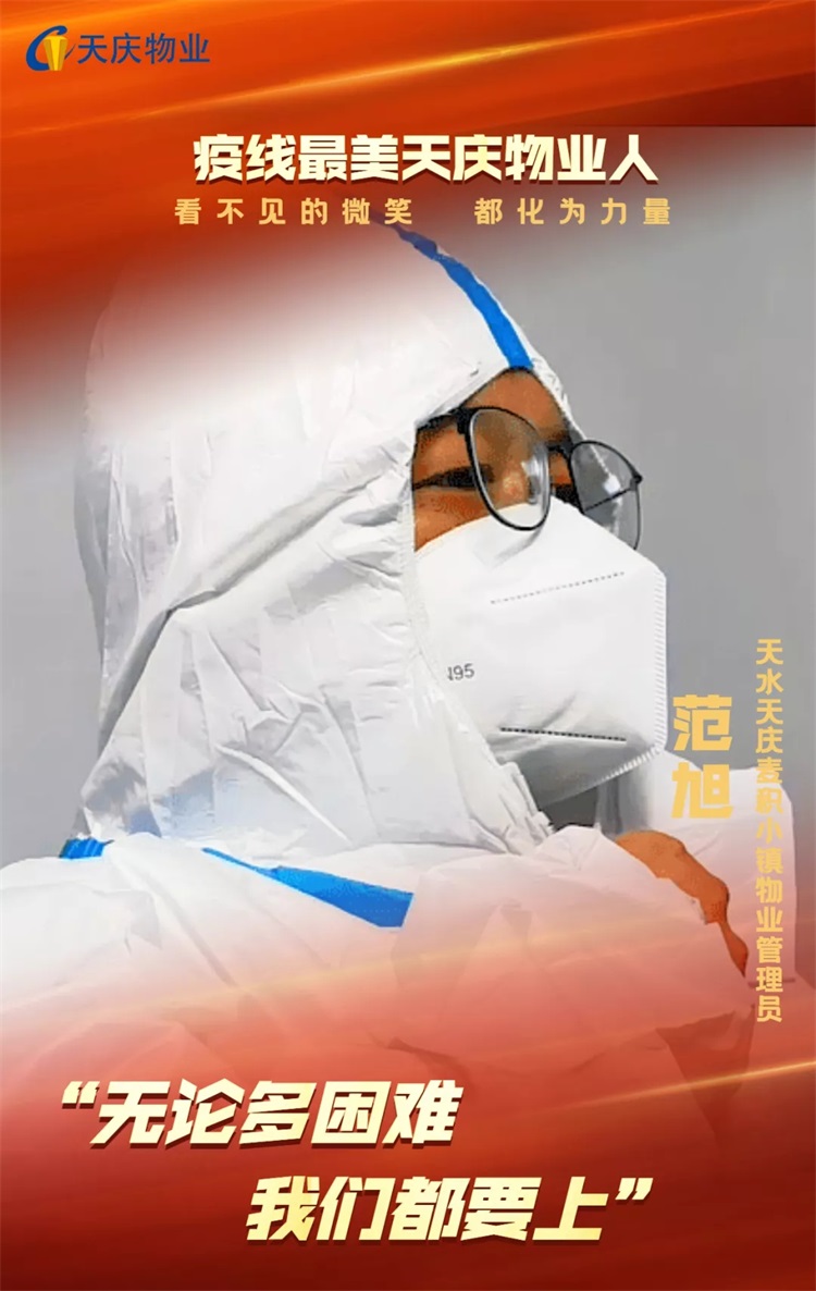 10月28日中午,他所负责的13号楼因为有密接人员被全面封闭了,业主得知后群里炸开了锅,不安、紧张、慌张席卷而来,大家讨论纷纷,这可如何是好?身为13号楼的负责管家,范旭和其他物业人员赶紧稳住业主情绪,迅速穿上防护服,还开玩笑说:“这是我人生第一次穿防护服,之前以为只有一线的医生才穿,想不到我也穿上了。”其实我们都知道他这是在给自己鼓气呢。