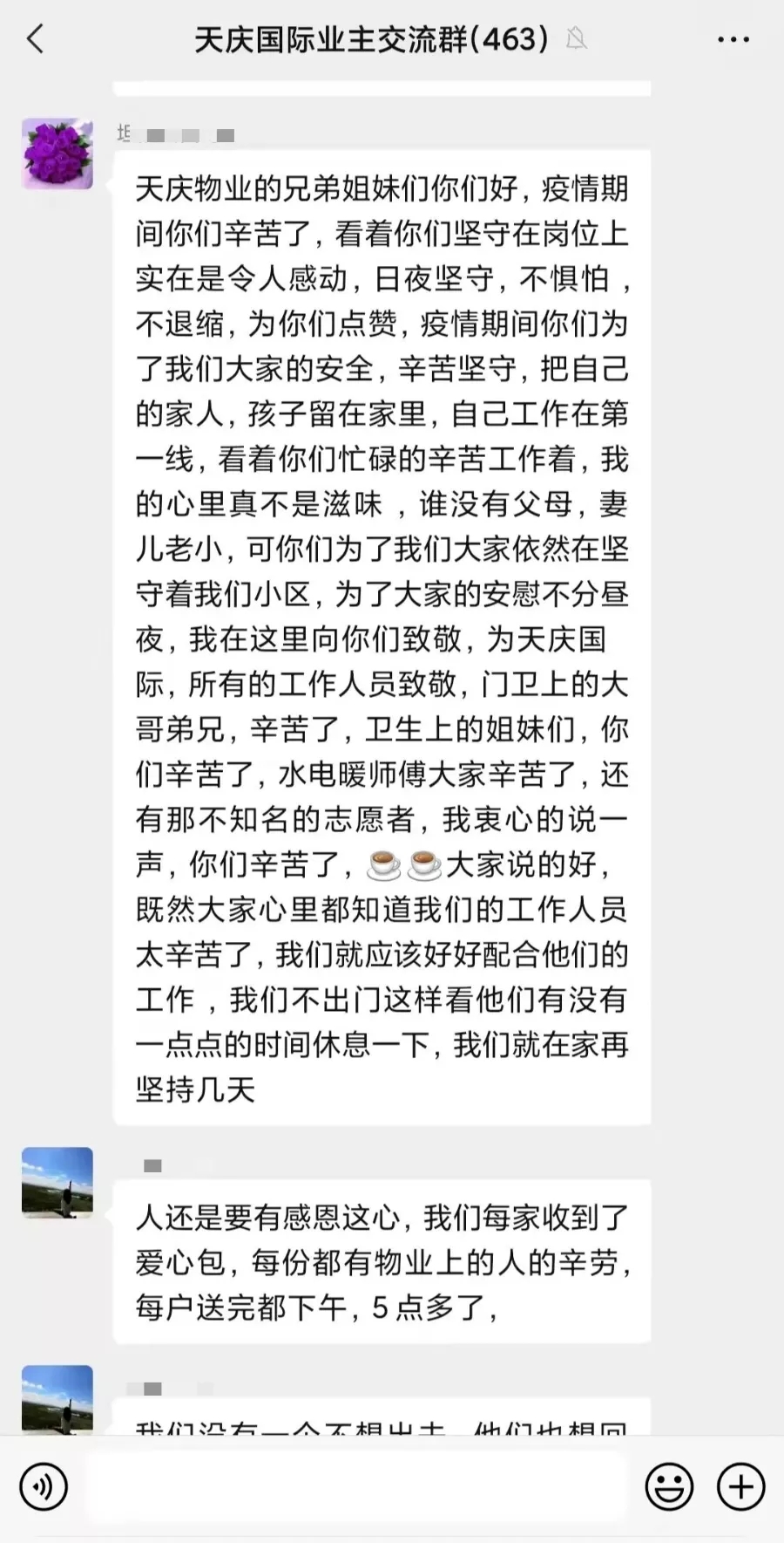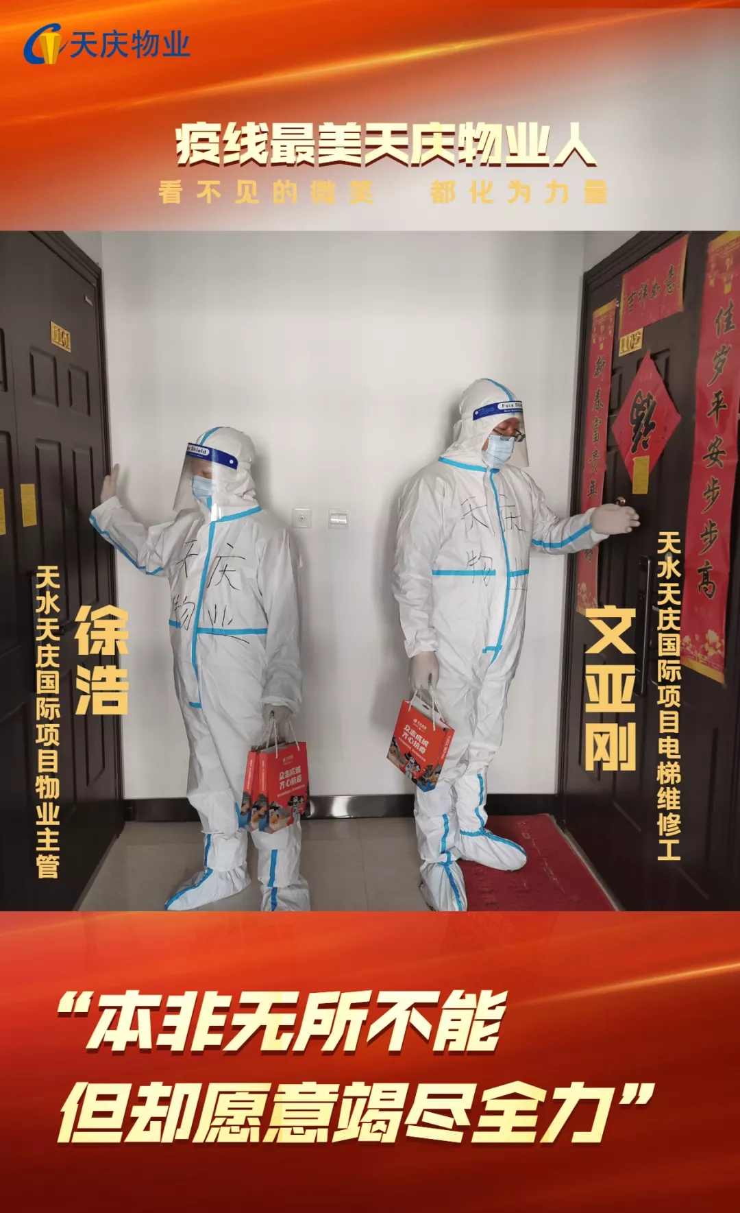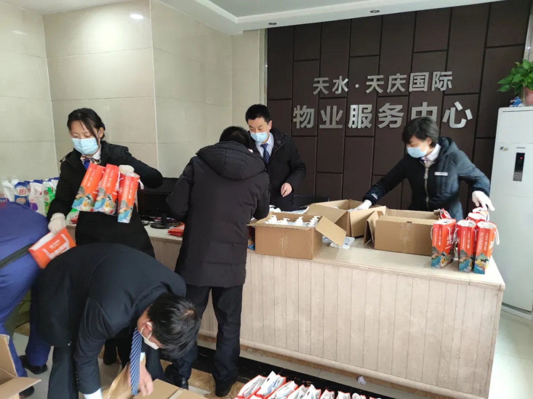 同时天庆集团得知天庆物业天水分公司物资紧缺后,火速组织物资支援,物资到达后,他带领天水项目员工逐户走访,给5000业主送去口罩、免洗洗手液和倡议信;业主收到后特别暖心,“在这种特殊时期,物业还能这么贴心,真心觉得我们的物业是最棒的。”