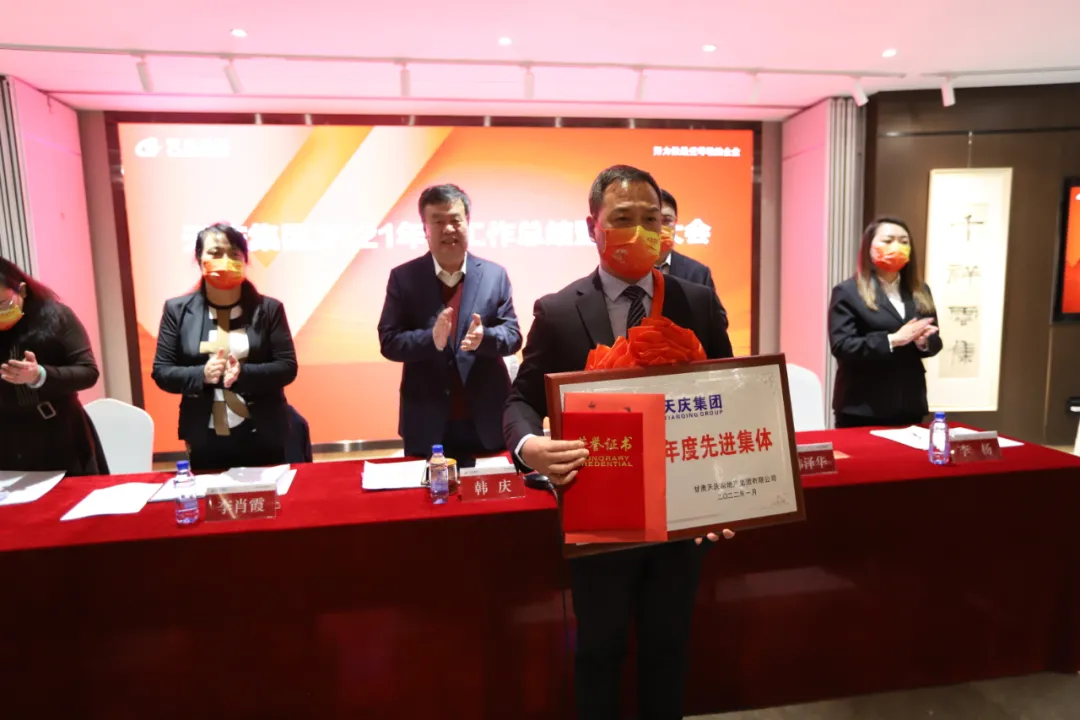 会上,天庆集团韩泽华总经理就集团公司在2021年所取得的成绩作了总结,并对2022年重点工作做出了详细部署,奠定了今后发展的总基调。2021年是天庆集团“五五战略”的开局之年,在党和政府的正确领导下,以助力建设幸福美好新甘肃为己任,助推实现共同富裕为目标,面对疫情冲击,天庆人迎难而上,稳中求进,取得了稳定的发展,全年获得“全国模范职工小家”、“甘肃省先进私营企业”、“甘肃省脱贫攻坚先进集体”等国家、省市级各类荣誉奖项95余项。2021年,天庆集团把文化产业作为企业转型升级的重要引擎,持续发力,实力不断增强。天庆博物馆以打造党性教育示范基地、研学教育基地为目标,深挖文化资源,不断升级,成为我省历史文化、科学艺术宣传展示的重要窗口和爱国主义教育的优秀平台。地产业务有序推进,实现三个项目交付入住,完成全年既定任务目标。物业服务方面,为20个项目2万余户业主提供贴心服务,获评“甘肃省最佳物业服务企业”。同时,天庆实验中学、幼儿园等教育教学质量稳中有升,商贸、酒店、园林、金融等多元化业务实现全面发展。