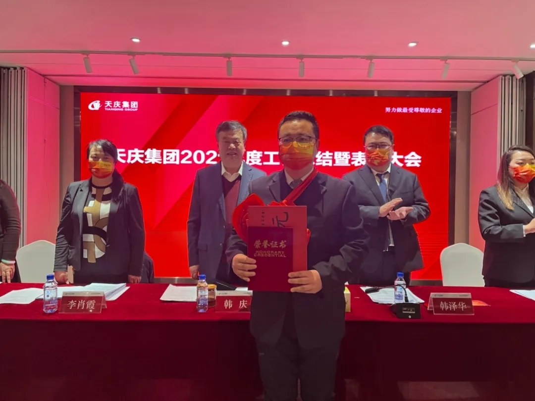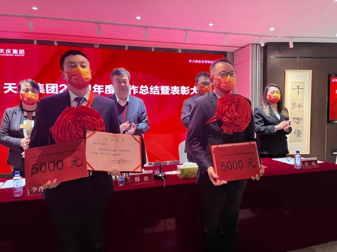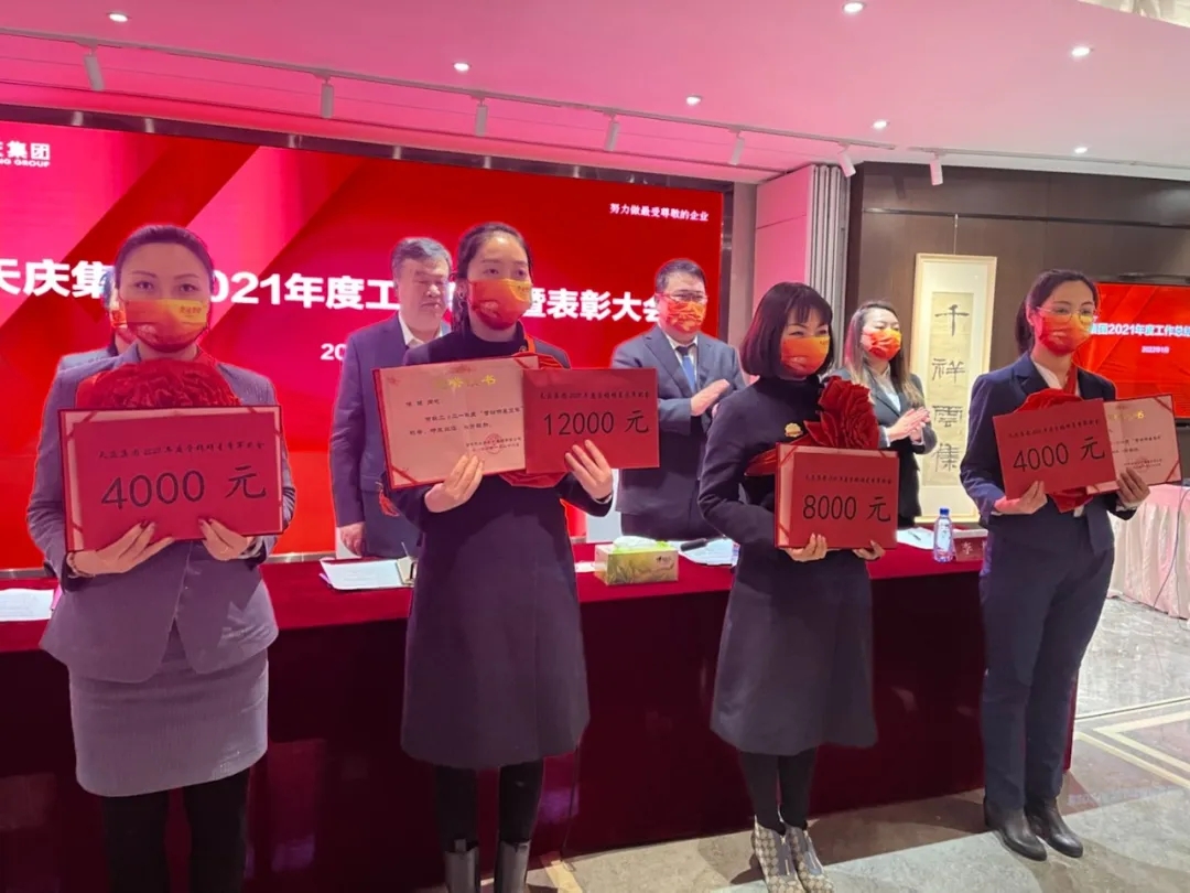回首2021年,天庆人“同心同梦同行”。 大会上,集团公司对2021年度“先进集体”“优秀管理者”“优秀员工”“销售明星”以及在抗疫工作中逆行而上、表现突出的“特殊贡献者”等进行了表彰奖励,鼓舞士气,为企业发展注入活力。