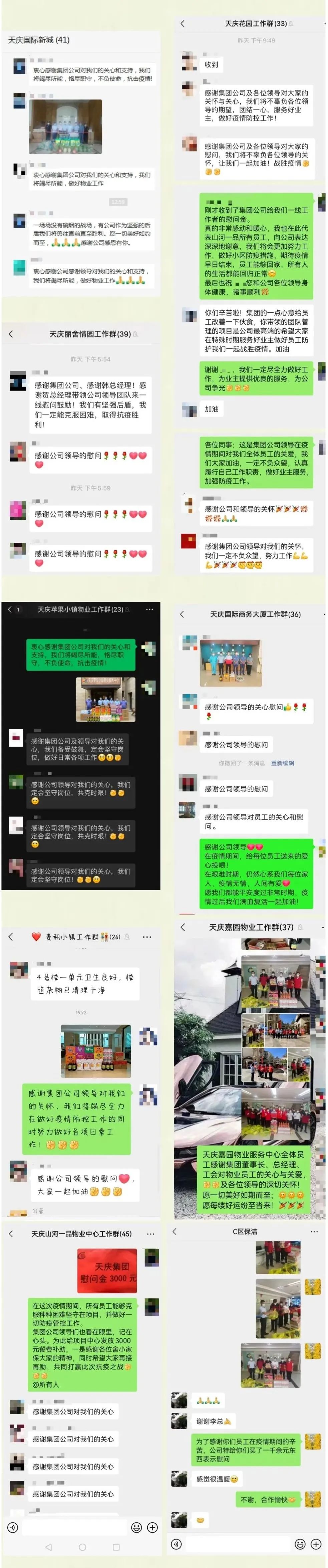 随着疫情攻坚战的不断深入,天庆集团董事长与总经理始终密切关注着天庆物业疫情防控工作,当得知由于疫情的原因,导致物业公司仍在坚守岗位的员工无法正常回家,每日吃住在单位,集团董事长与总经理心中牵挂着大家,拿出十万余元,用于物业疫情防控,为物业的一线人员送去关心和慰问。