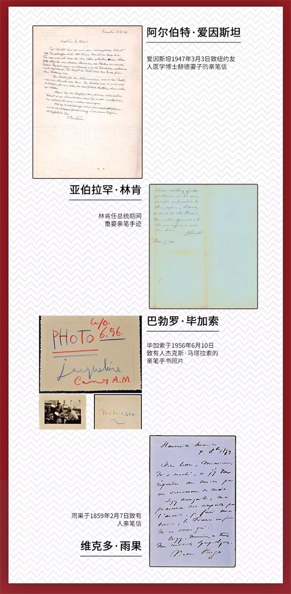 2“触摸历史”部分将展出爱因斯坦、雨果、托尔斯泰、毕加索等世界级文化名人,拿破仑、罗斯福、林肯、斯大林、丘吉尔等国外政界领袖的手迹,以及大众耳熟能详的“登月第一人”阿姆斯特朗、喜剧电影超级巨星卓别林、著名建筑师埃菲尔等诸多类型海内外名人的珍贵亲笔书信集中展示,为我们研究和探讨国內外各个时期的生活细节,体悟时代伟人的历史处境、文化趣味及学术思想提供了难得的参考依据。