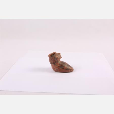 马家窑文化马厂类型靴面附塑人头彩陶靴型器 高:5.9cm 长:10cm 距今约4350年-4000年