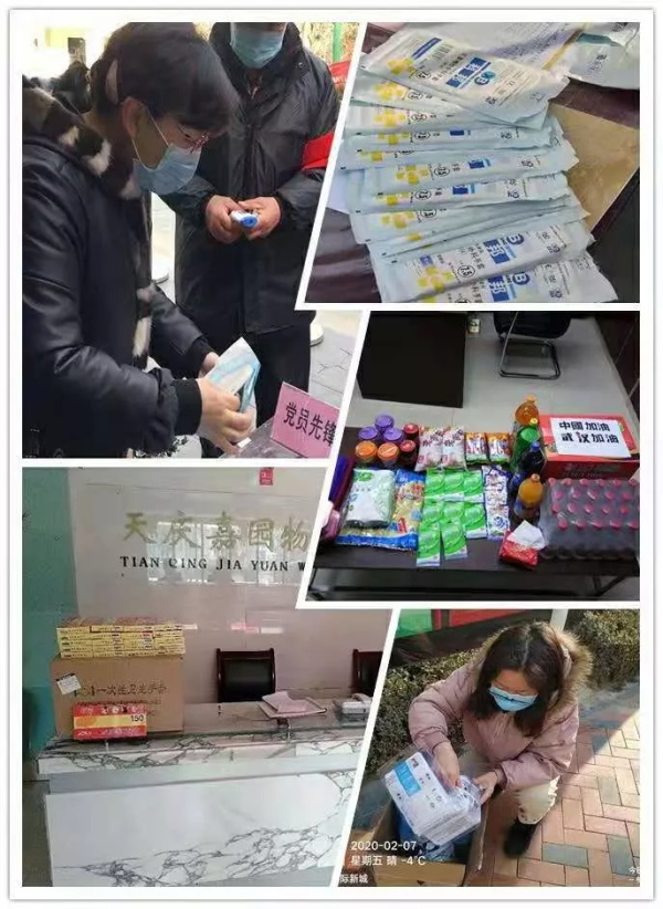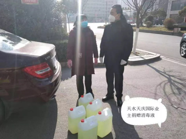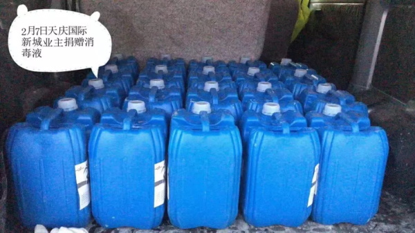 天庆国际新城、天水·天庆国际的业主得知物业服务中心防疫物资紧缺,他们自筹资金购买消毒液,免费赠送给天庆物业服务中心,缓解了服务中心消毒液紧缺的燃眉之急。他们说“我们不图回报,只想为小区防疫工作尽自己的一点绵薄之力”