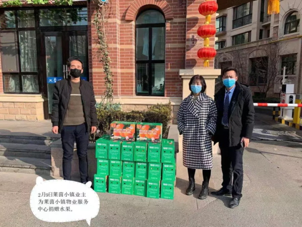 2月9日,20多箱新鲜的水果,放在了天庆莱茵小镇小区门前,这是天庆业主暖心为物业工作人员捐助的。业主说“我不知道能为你们做些什么,看到你们为小区业主的辛苦付出,我只能尽我自己的一点绵薄之力,希望我们能够共同战胜疫情”。还有一些业主,他们来到物业一线岗位,为工作人员送上了口罩、手套、消毒酒精等物资,没有留下任何信息,只是淡淡说一句:“你们辛苦了,你们比我更需要这些”便转身离开。