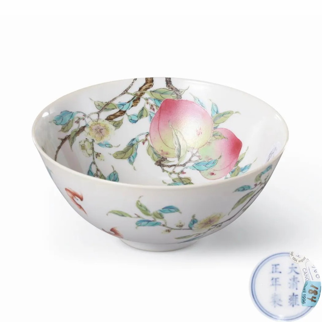清雍正 粉彩六桃五蝠过枝“福寿双全”图碗