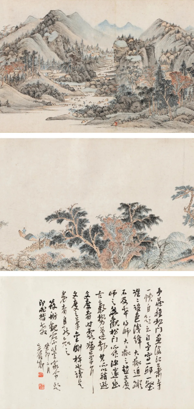1.郑元勋、董其昌、吴昌硕题跋。郑元勋(1598-1645),字超宗,号惠东,原籍为安徽,后居扬州。崇祯十六年(1643)进士,后请假归乡,次年授兵部职方司主事。工诗善画,为江东名流。善山水,宗吴镇,尤工山水小景,措笔洒落全以士气得韵。