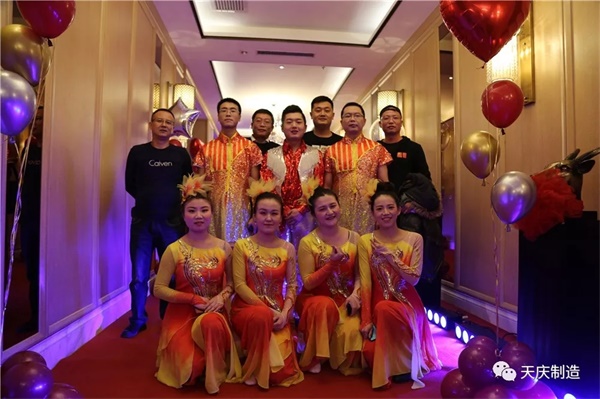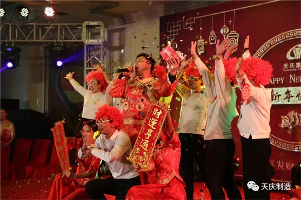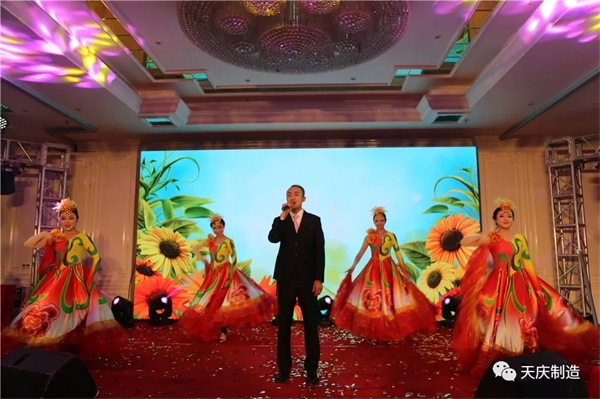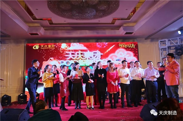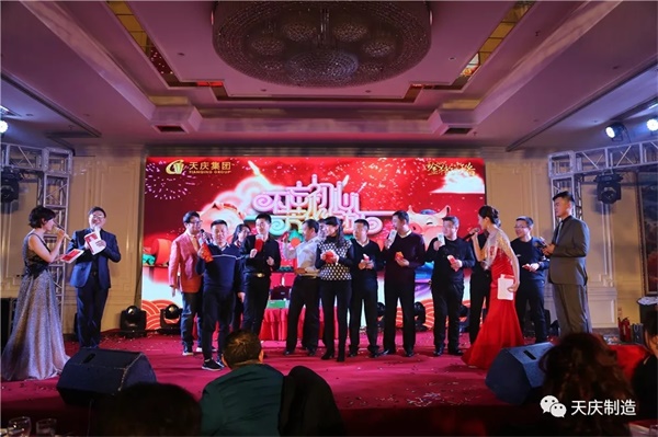 晚宴将至,韩泽华总经理携集团公司全体高层登台祝酒,感谢韩庆董事长为天庆打下的基石、感谢集团全体职工不辞辛劳的付出和兢兢业业的贡献,在新的一年不负董事长的殷切期望,继续大力谋发展,升级谋转型,发力多元化。