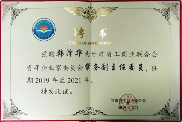 图4 省工商联常委、天庆集团总经理韩泽华在大会上被聘为甘肃省工商联青年企业家委员会常务副主任委员