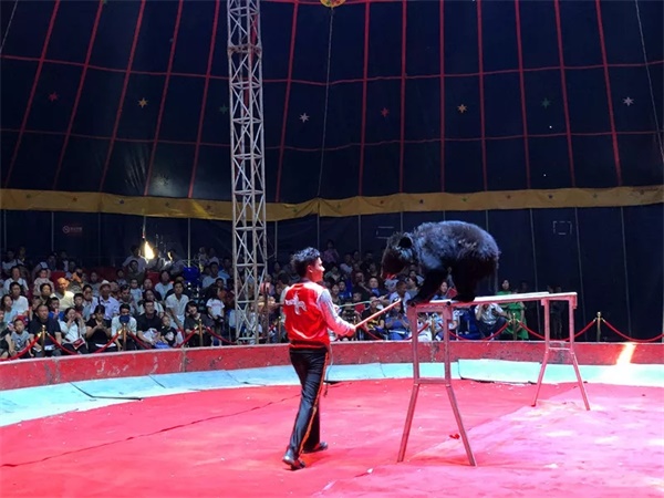 精彩的马戏团表演在猛兽们帅气的登场中拉开序幕。威猛的狮子在驯兽师的指引下,一跃钻过钢圈,身姿矫健,传说中的百兽之王果然名不虚传,尽显王者霸气。现场还有憨厚可爱的黑熊,它在驯兽师的引导下不断向观众展示自己的技能。大黑熊在引导下摇摇晃晃表演跳障碍的呆萌表情,萌化在场观众的心。