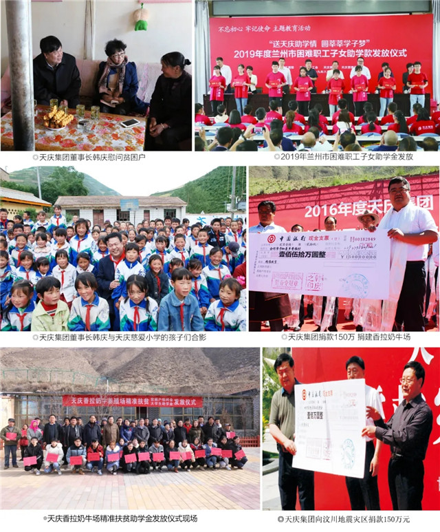 二十年砥砺前行,初心不改,爱心路上成果显著:“香拉奶牛场”的捐建,开创了良性循环的产业脱贫新模式,成为合作市农村三变改革示范、脱贫攻坚巩固提升工程的代表;连续十三年“送天庆助学情 圆莘莘学子梦”大型助学活动,圆3000名贫困学子大学梦,有效阻断了贫困的代际传递,实现一人就业全家脱贫目标;5所”天庆慈爱小学“的捐建,为实现“造血式”扶贫,注入了不竭动力;值得一提的是,疫情当前,天庆集团50万捐款、1000万商业租金减免,稳岗就业不裁员,全力助力疫情阻击、复工复产,种种善举汇聚成天庆慈善品牌、责任企业品牌,截至目前,已累计向社会公益慈善事业捐资捐助1亿多元。除此,随着企业的不断发展壮大,累计向社会提供就业岗位万余个,上缴税金超18亿元,蝉联7年“甘肃省纳税百强企业”荣誉称号,为我省社会经济文化发展做出了突出贡献。