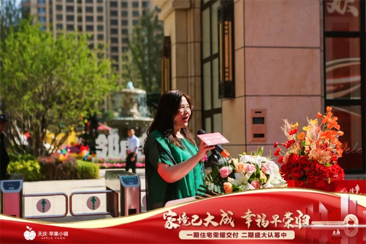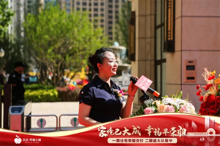 业主代表上台说着自己的交房感言!“天庆没让我失望,苹果小镇比我想象中建设的更美,走进小区让我感觉就像在公园里!”