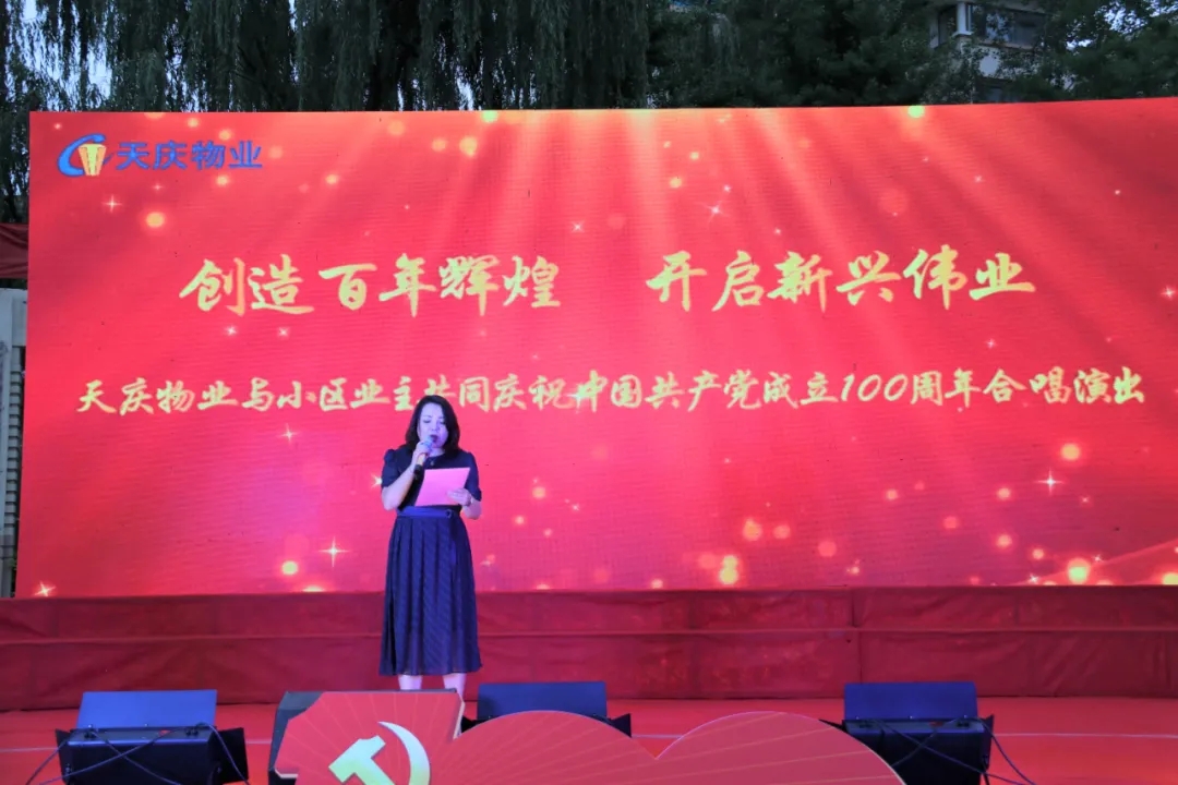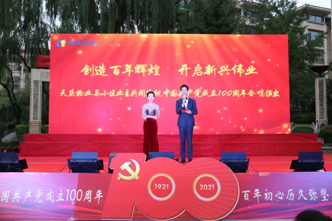 值此建党一百周年之际,6月22日晚,由甘肃天庆物业管理有限公司主办、天庆物业党支部承办、天庆嘉园业主委员会、天庆花园业主委员会、天庆丽舍情园业主委员会、天庆莱茵小镇业主委员会、天庆格林小镇业主委员会、天庆国际新城业主代表协办的“创造百年辉煌·开启新兴伟业”庆祝建党100周年合唱演出在兰州天庆嘉园隆重举办。