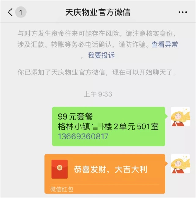 第二步,长按识别二维码添加“天庆物业微信号”,留言订购需求、小区单元房号及联系方式