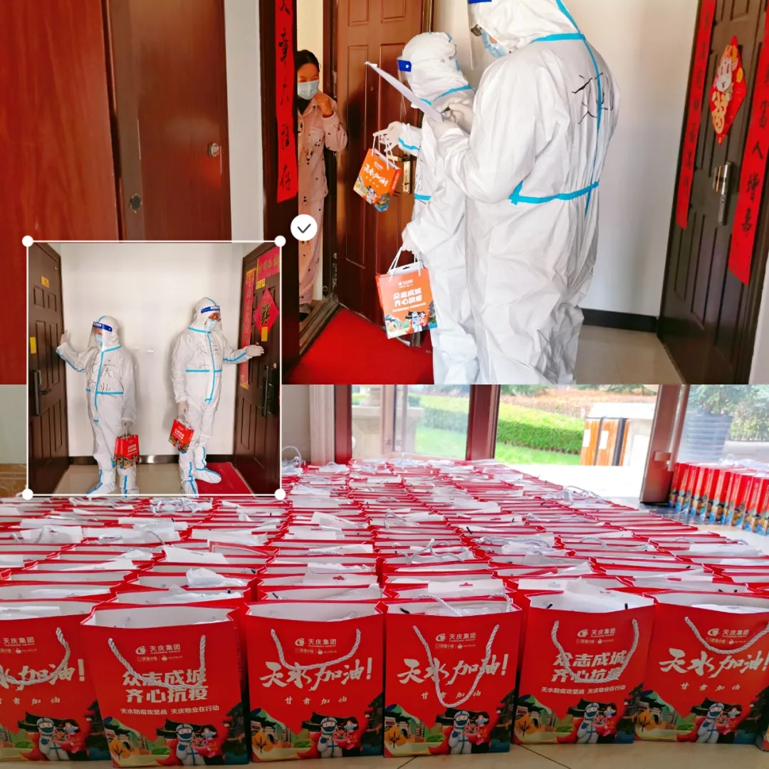 同时天庆集团得知天庆物业天水分公司物资紧缺后,火速组织物资支援,物资到达后,他带领天水项目员工逐户走访,给5000业主送去口罩、免洗洗手液和倡议信;业主收到后特别暖心,“在这种特殊时期,物业还能这么贴心,真心觉得我们的物业是最棒的。”