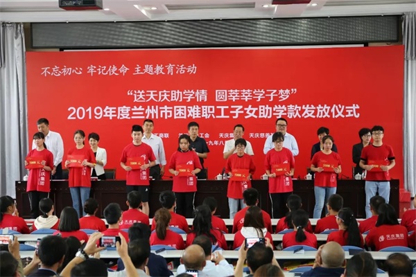 8月23日下午,天庆集团“不忘初心 牢记使命”主题教育活动暨“送天庆助学情 圆莘莘学子梦”2019年度兰州市困难职工家庭学子助学款发放仪式在兰州天庆实验中学隆重举行。天庆集团与兰州市总工会联合开展的第四轮捐资助学活动正式开启,为来自兰州市困难职工家庭新入学的本科生和研究生共计50人每人送上5000元助学款。